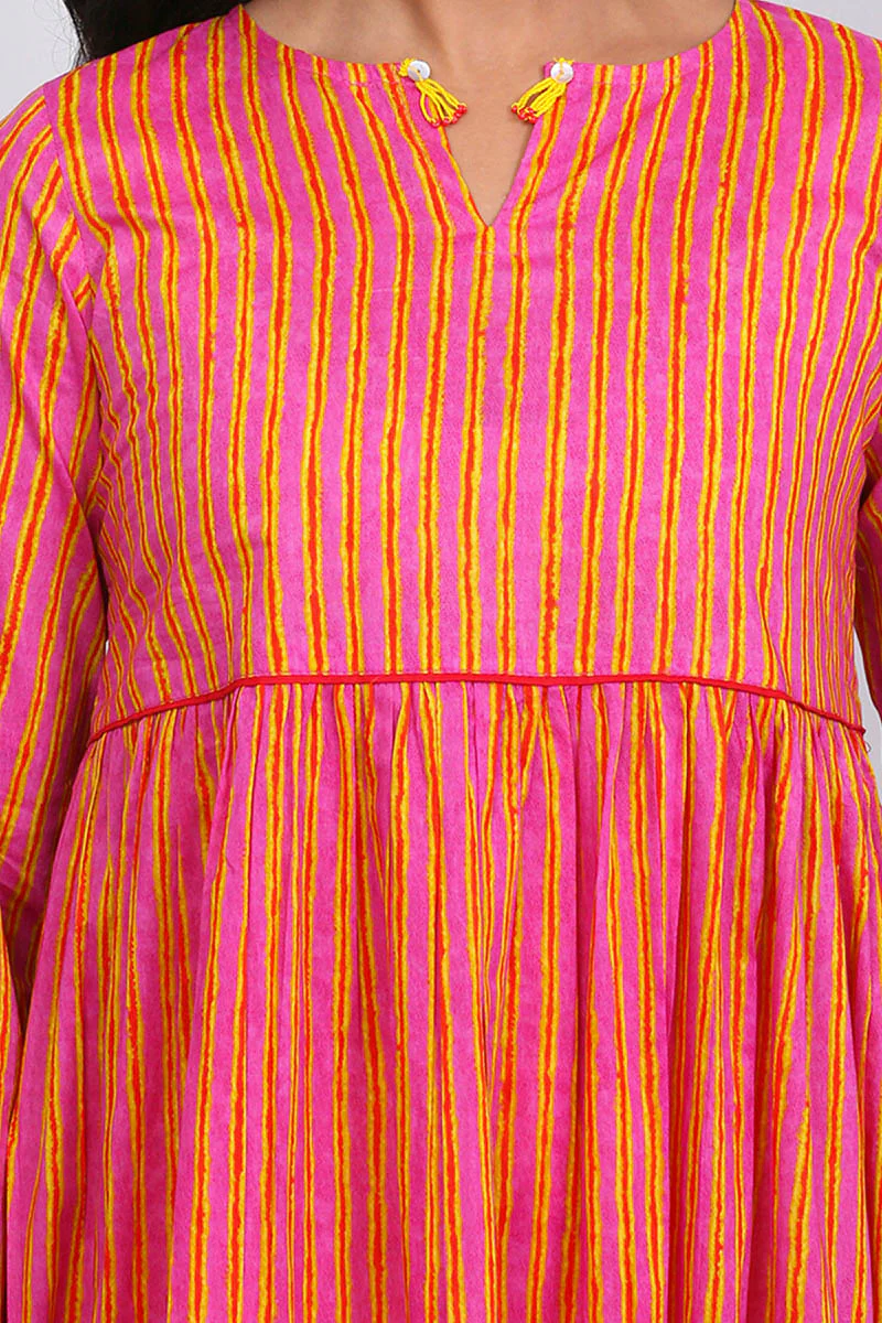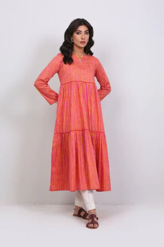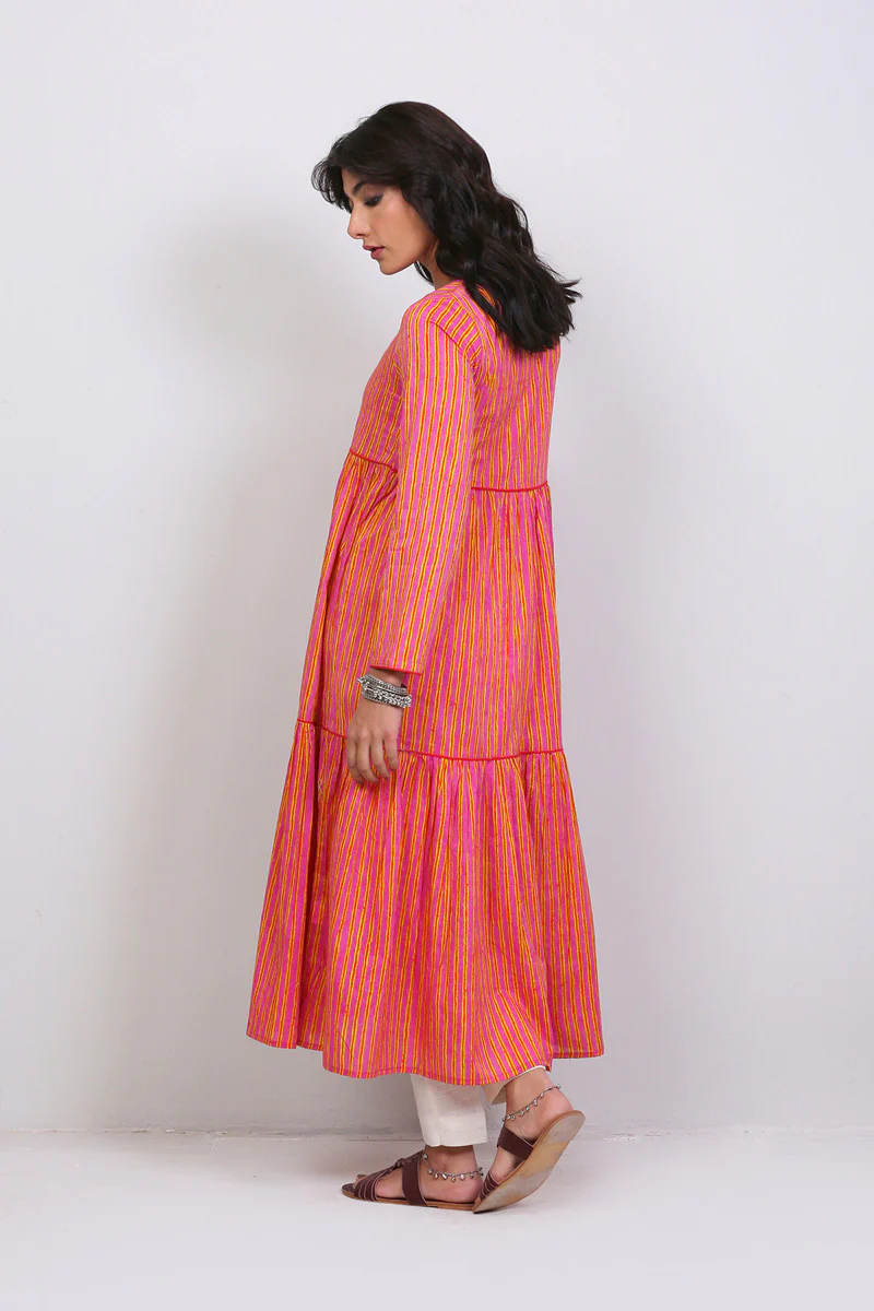 Tiered printed long dress with gathers, adorned with tassel details on neckline.