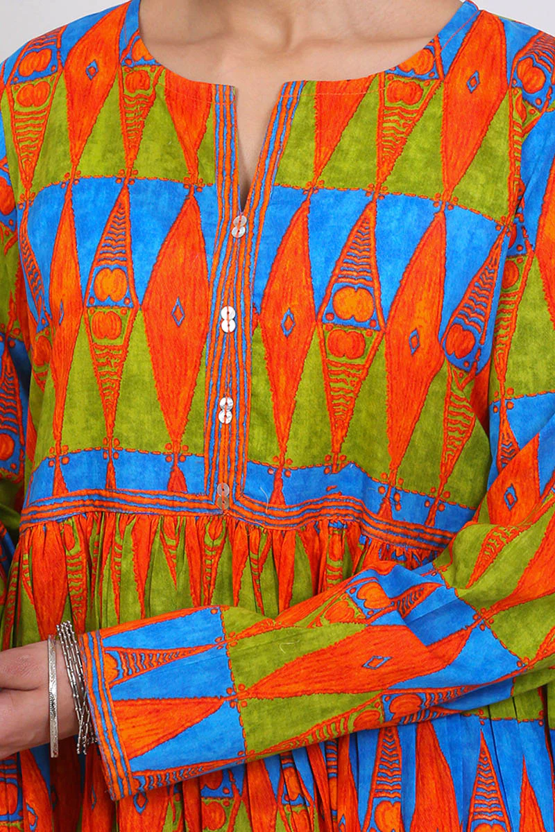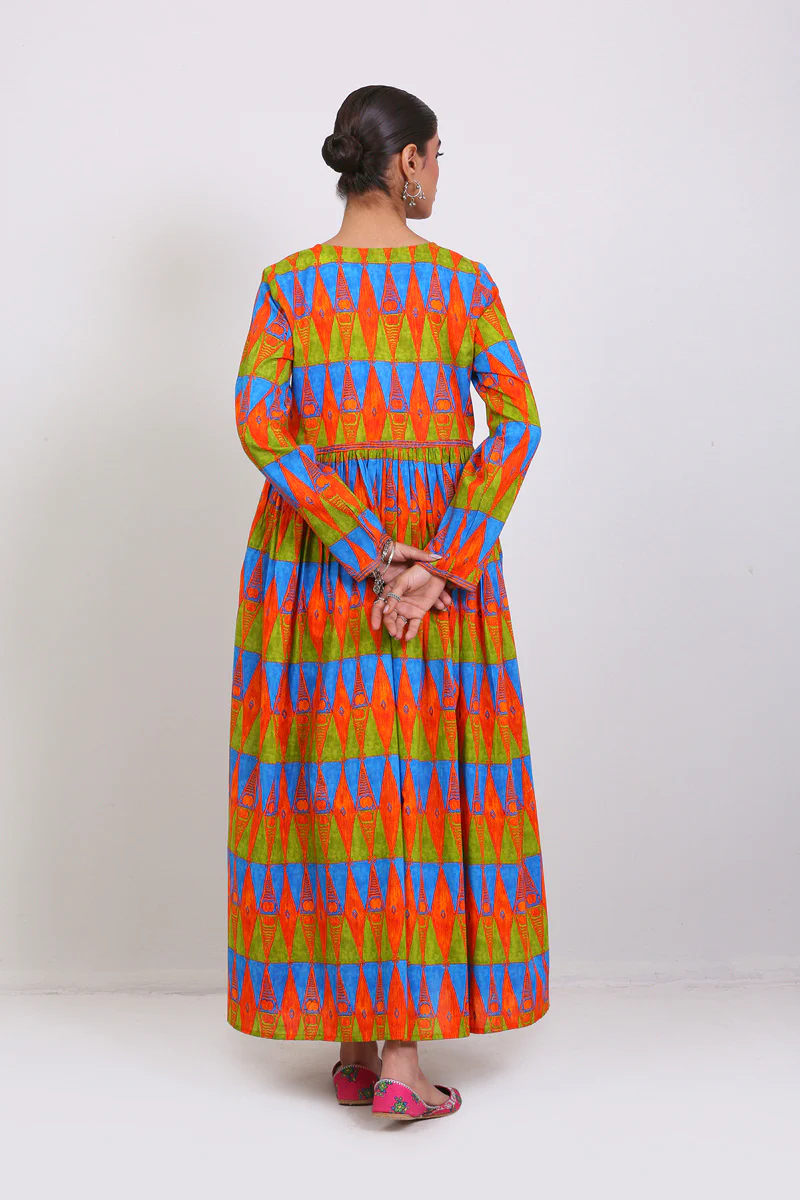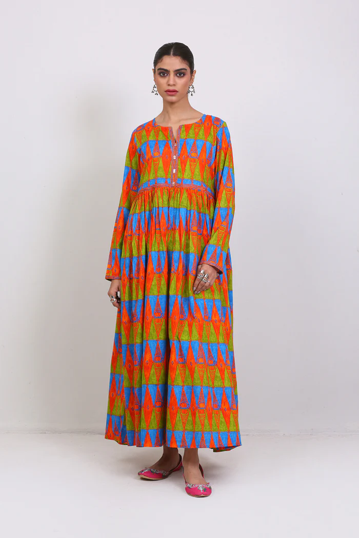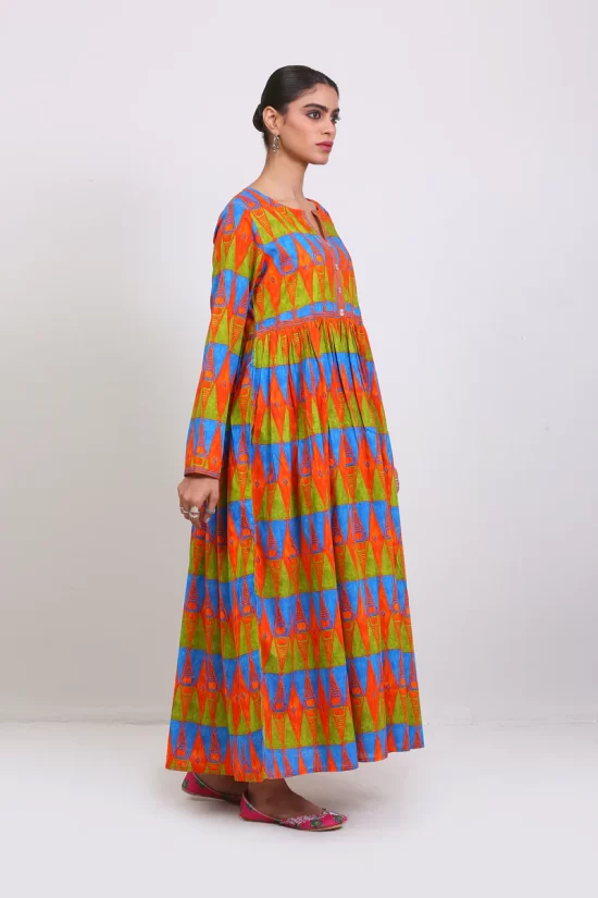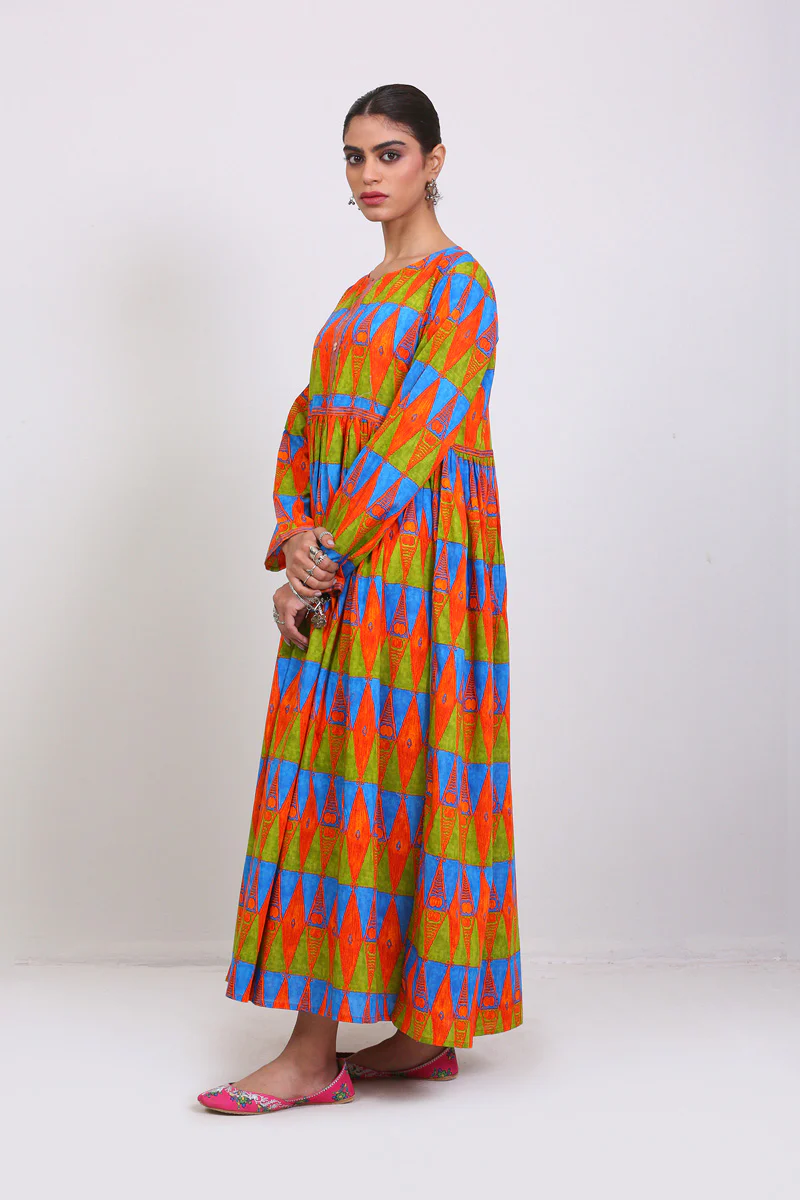 Flared, printed dress with gathers on waist and buttons on neckline.