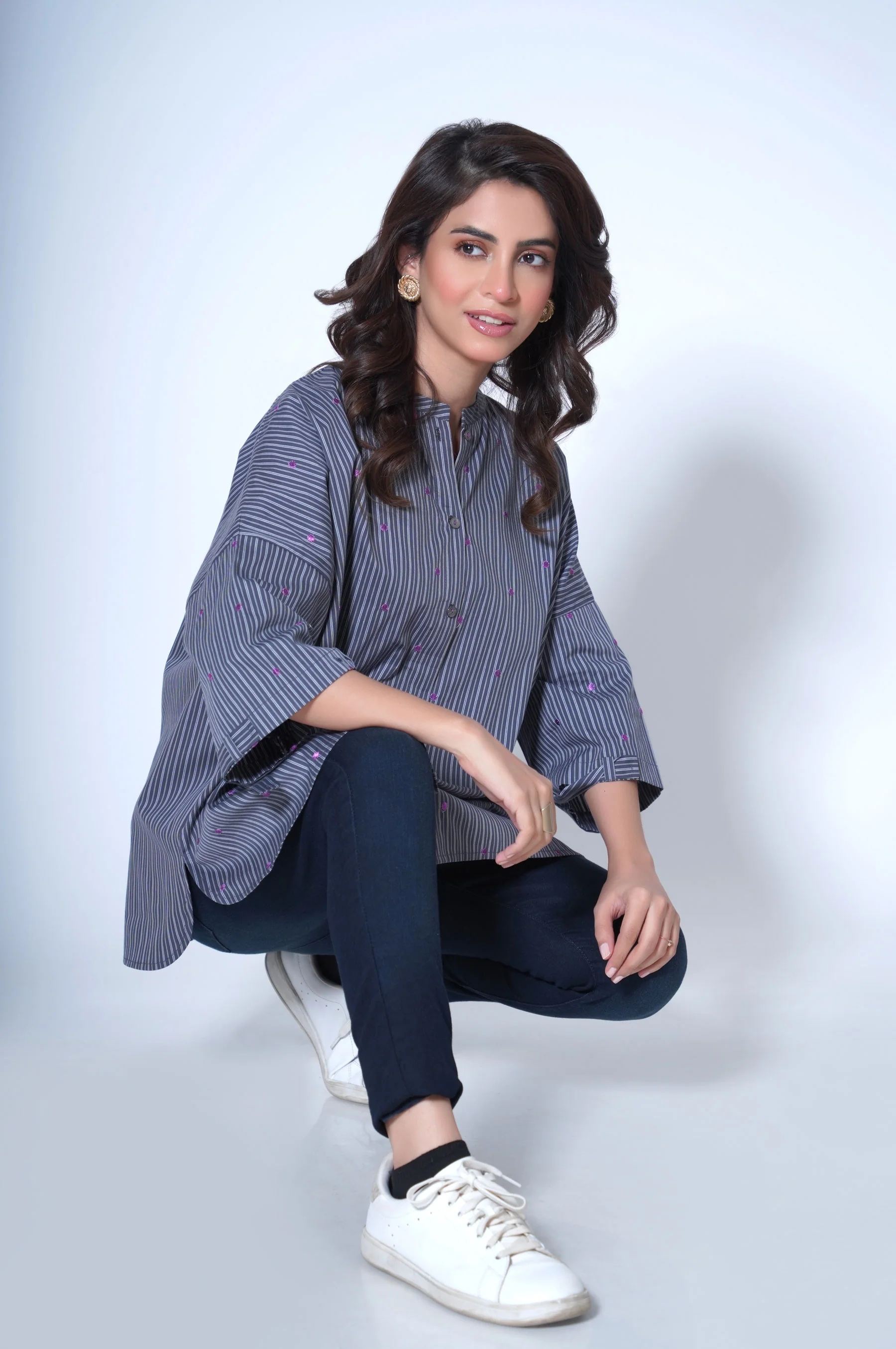 Band Collar, Drop Shoulder and Three Quarter Sleeves