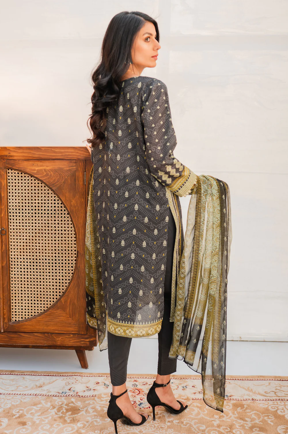Printed Slub Lawn Shirt with Embroidered Neckline, Digital Printed Chiffon Dupatta, Dyed Cambric Bottom,Dori,Lace & Beads for Embellishment